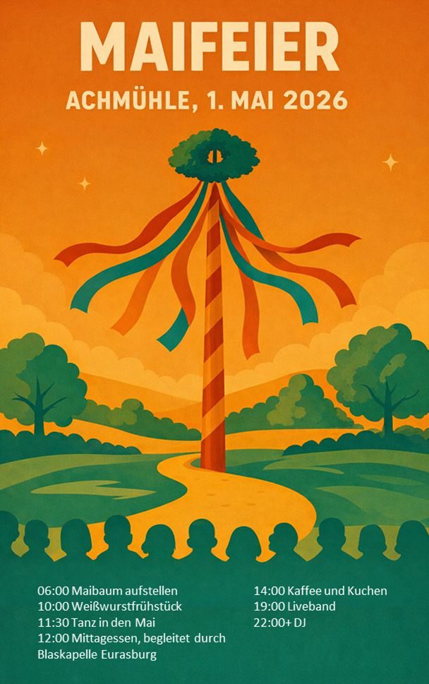 Achmühle wird dieses Jahr wieder einen neuen Maibaum erhalten. Die Vorbereitungen hierzu laufen bereits auf Hochtouren: Es wurde ein Baum ausgesucht, gefällt und auf das naheliegende Feld am Ortsrand gebracht. Am 6. Januar 2026 hieß es dann, den Baum zu schepsen, so dass er bis Mai besser trocknen kann.